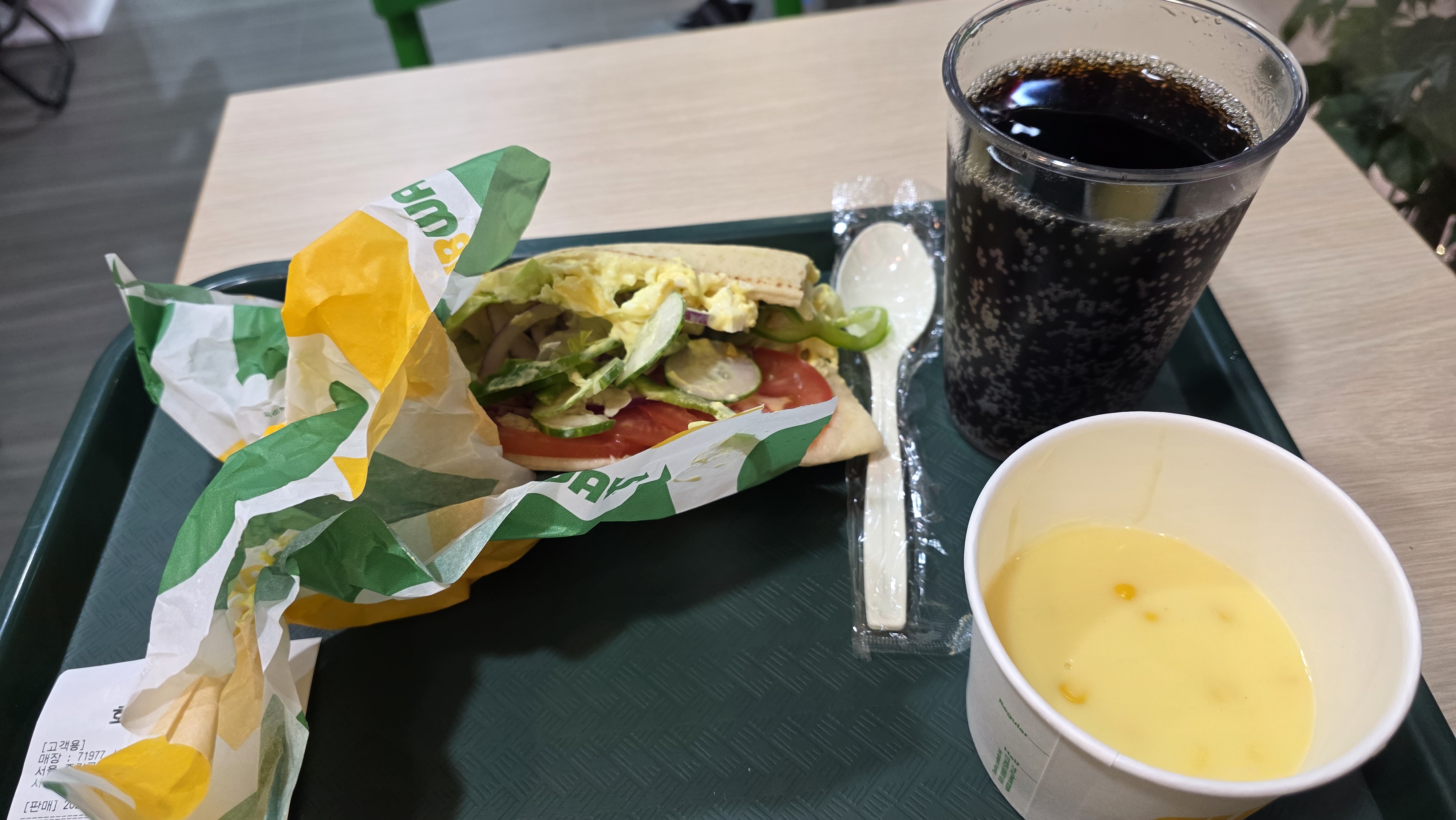 - 메뉴: 에그마요 샌드위치 + 콜라 + 옥수수 스프 (10,400원)