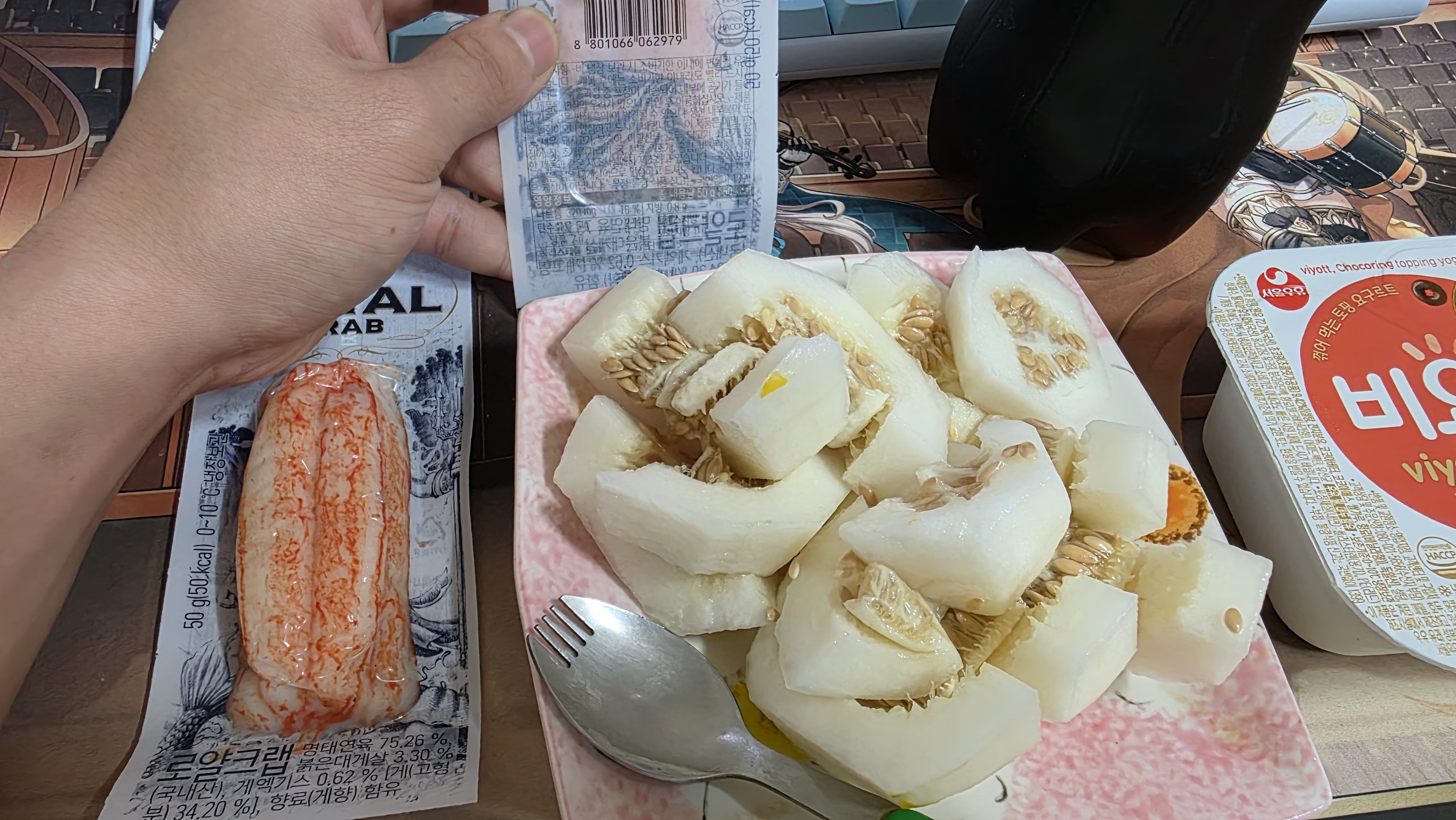 - 간식 : 비요뜨 1개, 맛살 1개, 참외, 요거트