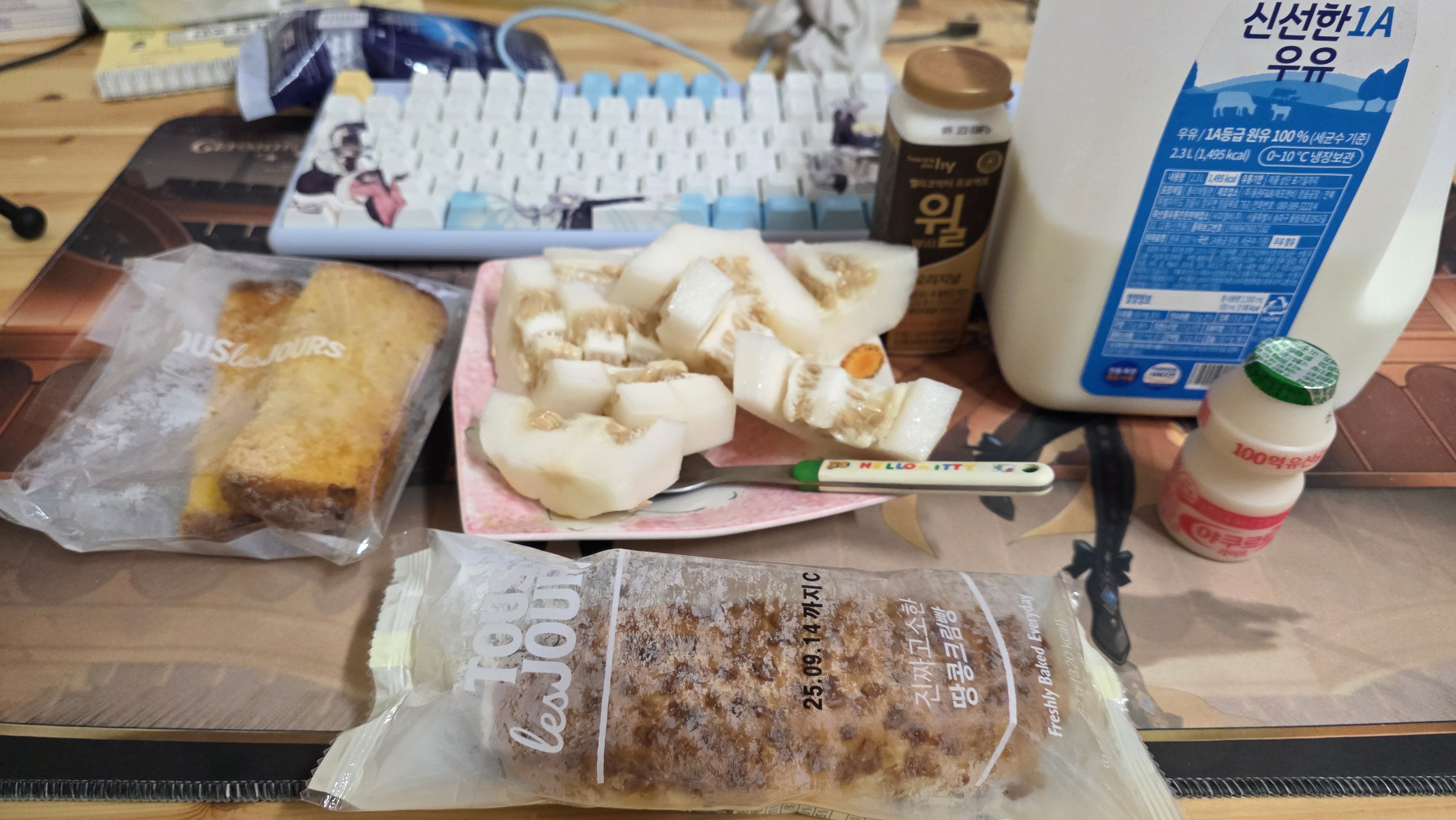 - 간식: 땅콩크림빵, 계란토스트, 참외, 우유 1.5컵, 윌, 야쿠르트 2개