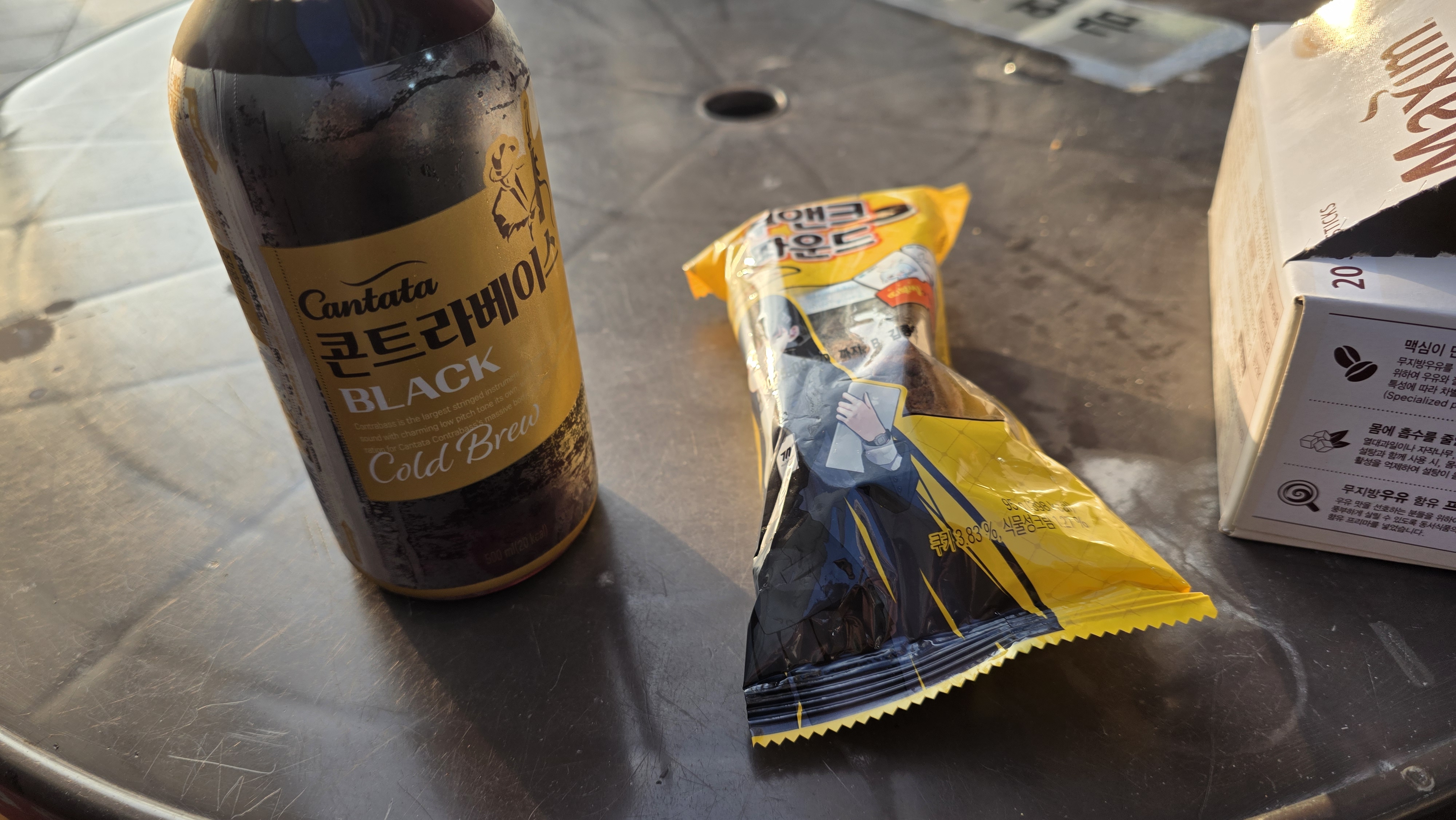 - 편의점: 블루아카이브 빵 + 아메리카노(500ml), 화이트모카 스틱 20개, 껌 구매(12,000원) → 빵과 아메리카노 바로 섭취