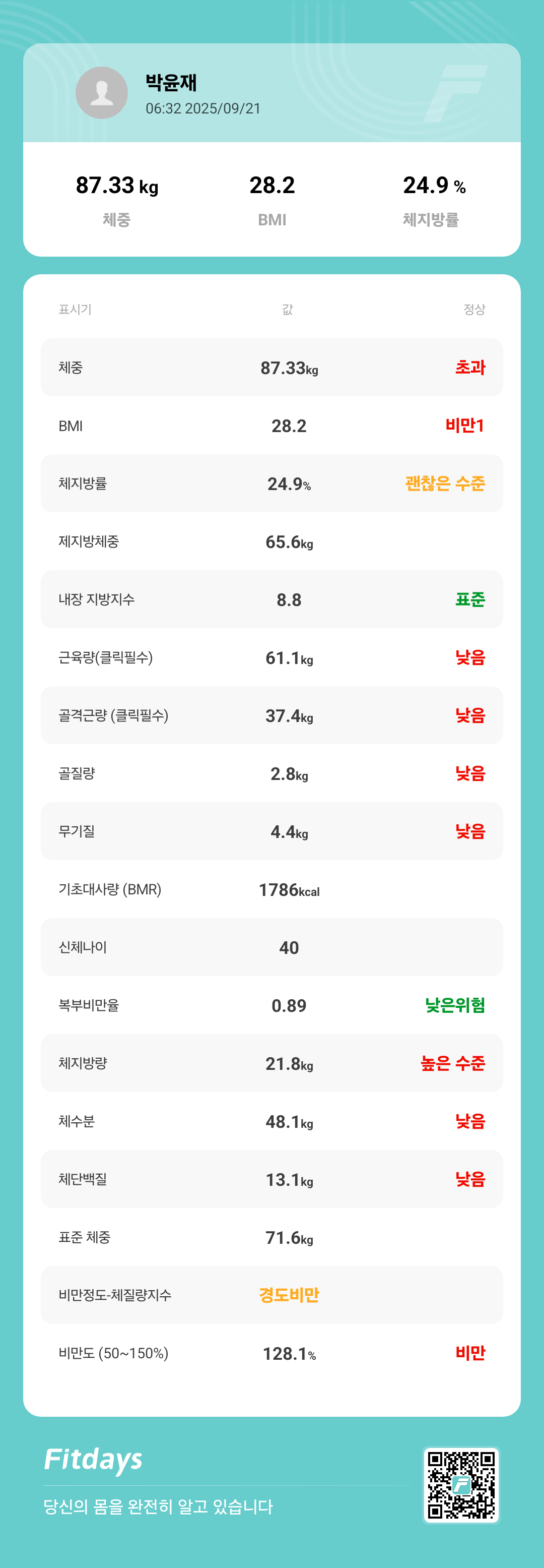 - 체중: 87.33kg (전일 대비 소폭 증가)