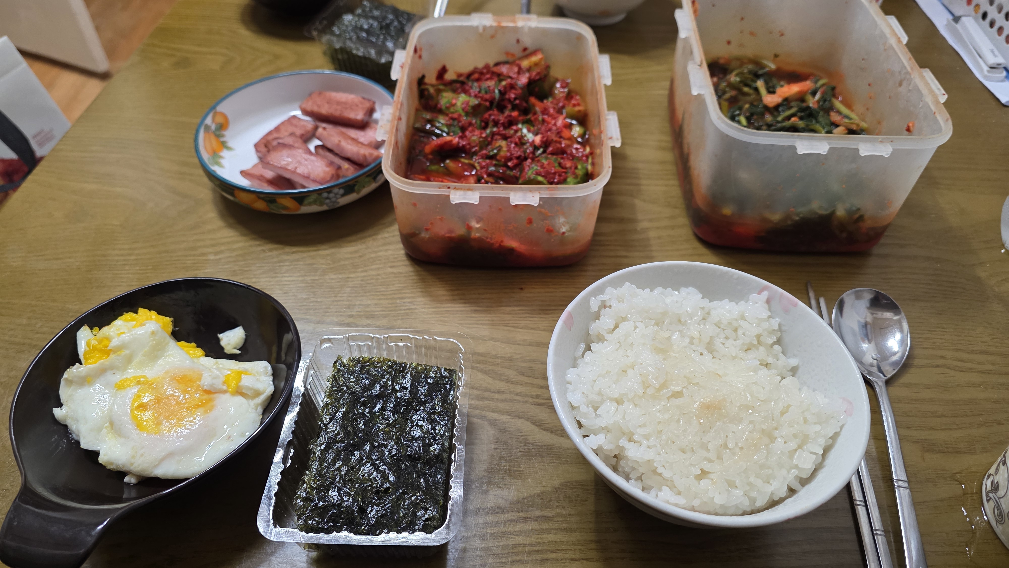 - 흰밥, 달걀후라이, 김, 반찬(고추무침, 김치, 채소무침 등)