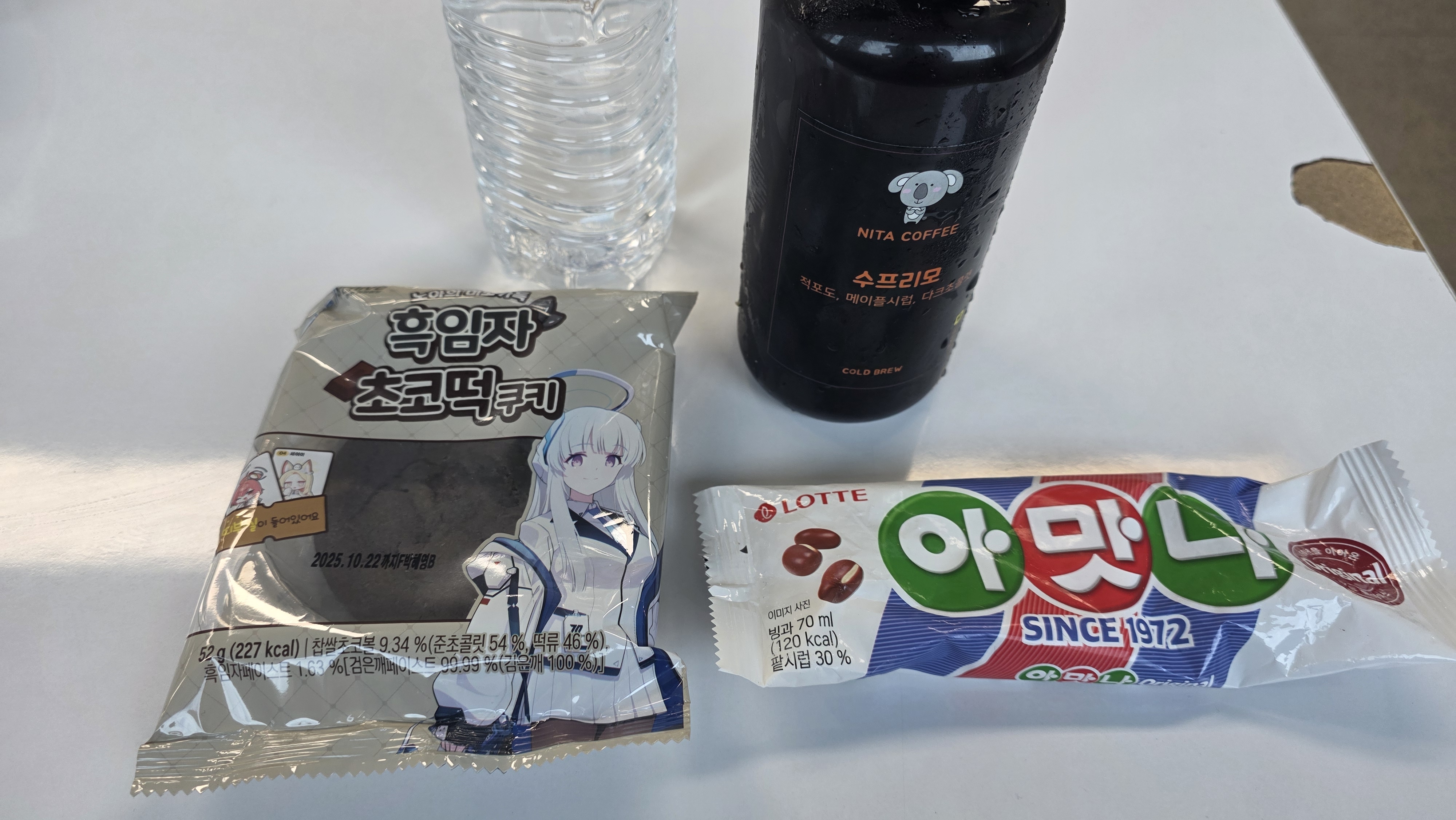 - 블루아카이브 빵, 롯데 아맛나 아이스크림, 커피 원액 + 물