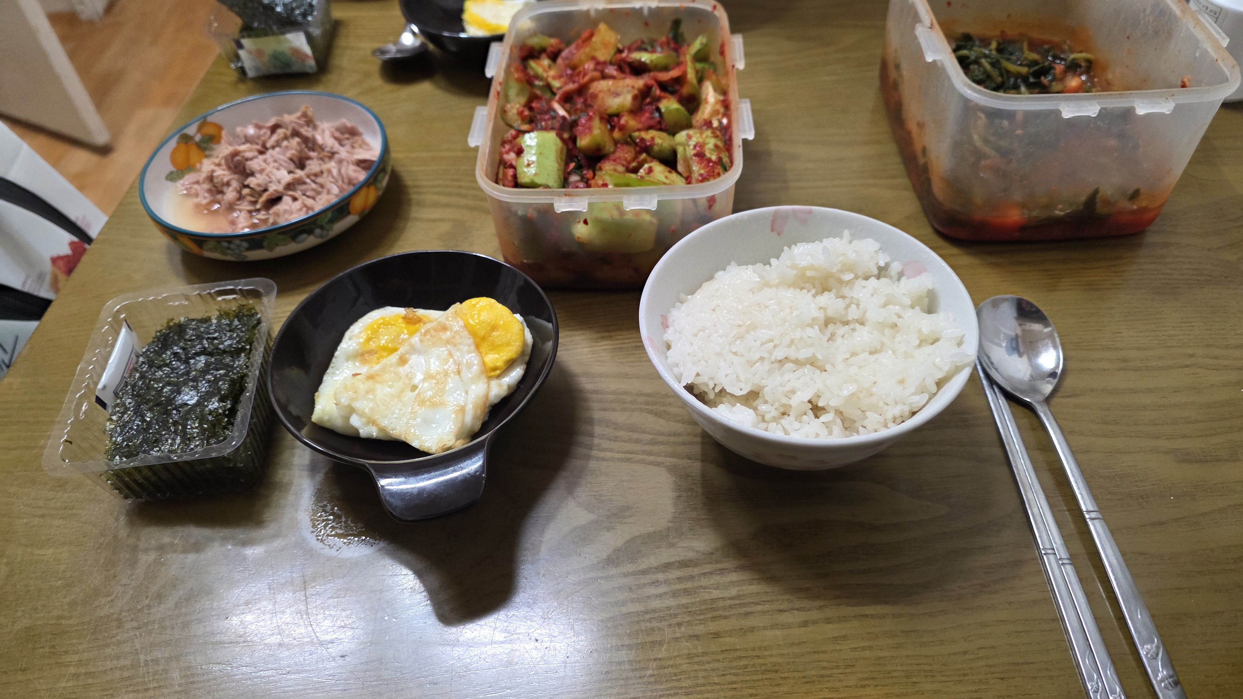 - 흰밥 한 공기, 김, 계란후라이 2개, 동원참치 1캔, 오이김치