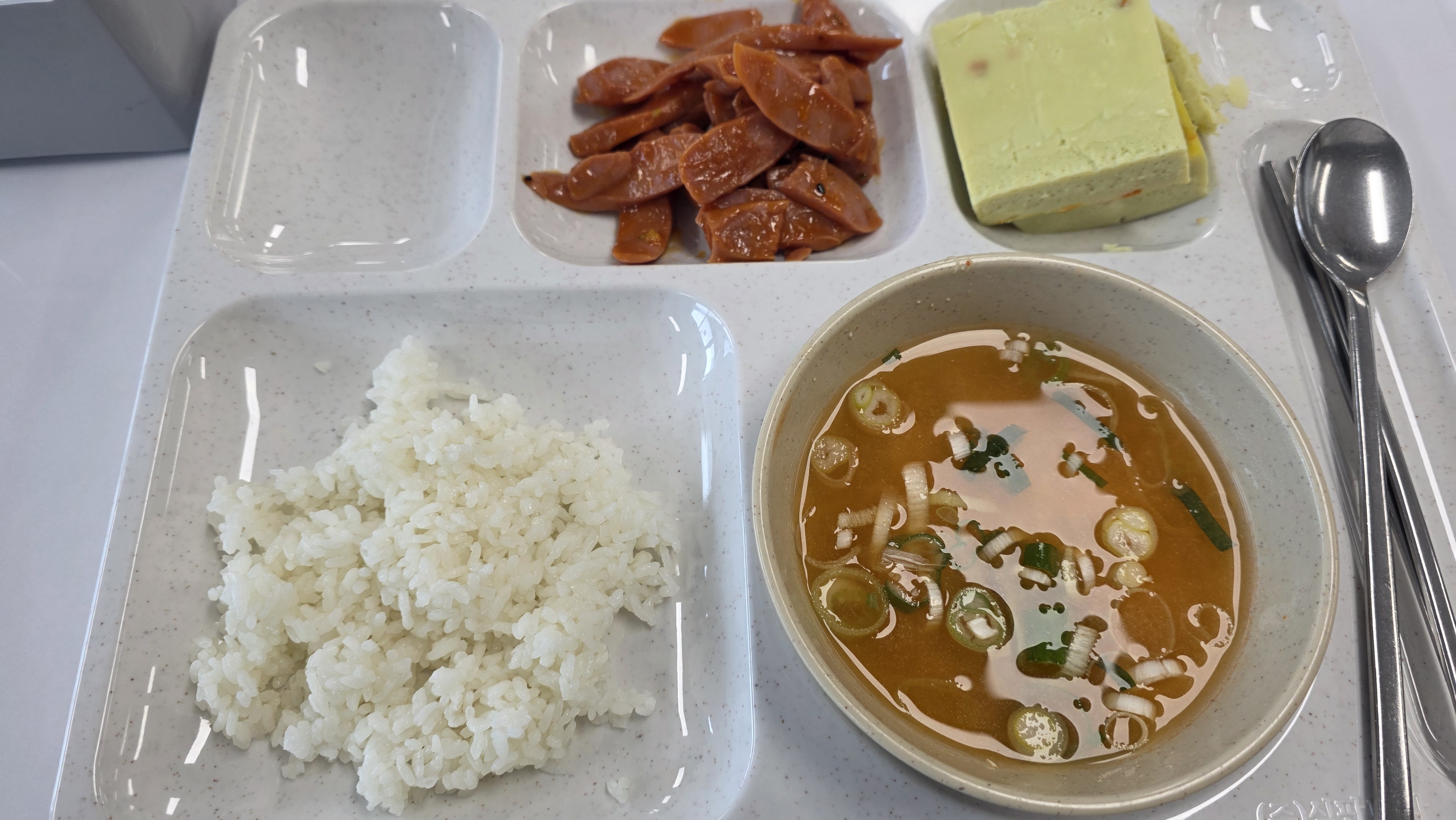 - 반찬: 된장국, 계란찜, 양념게장, 샐러드, 떡볶이, 양파, 상추, 깻잎