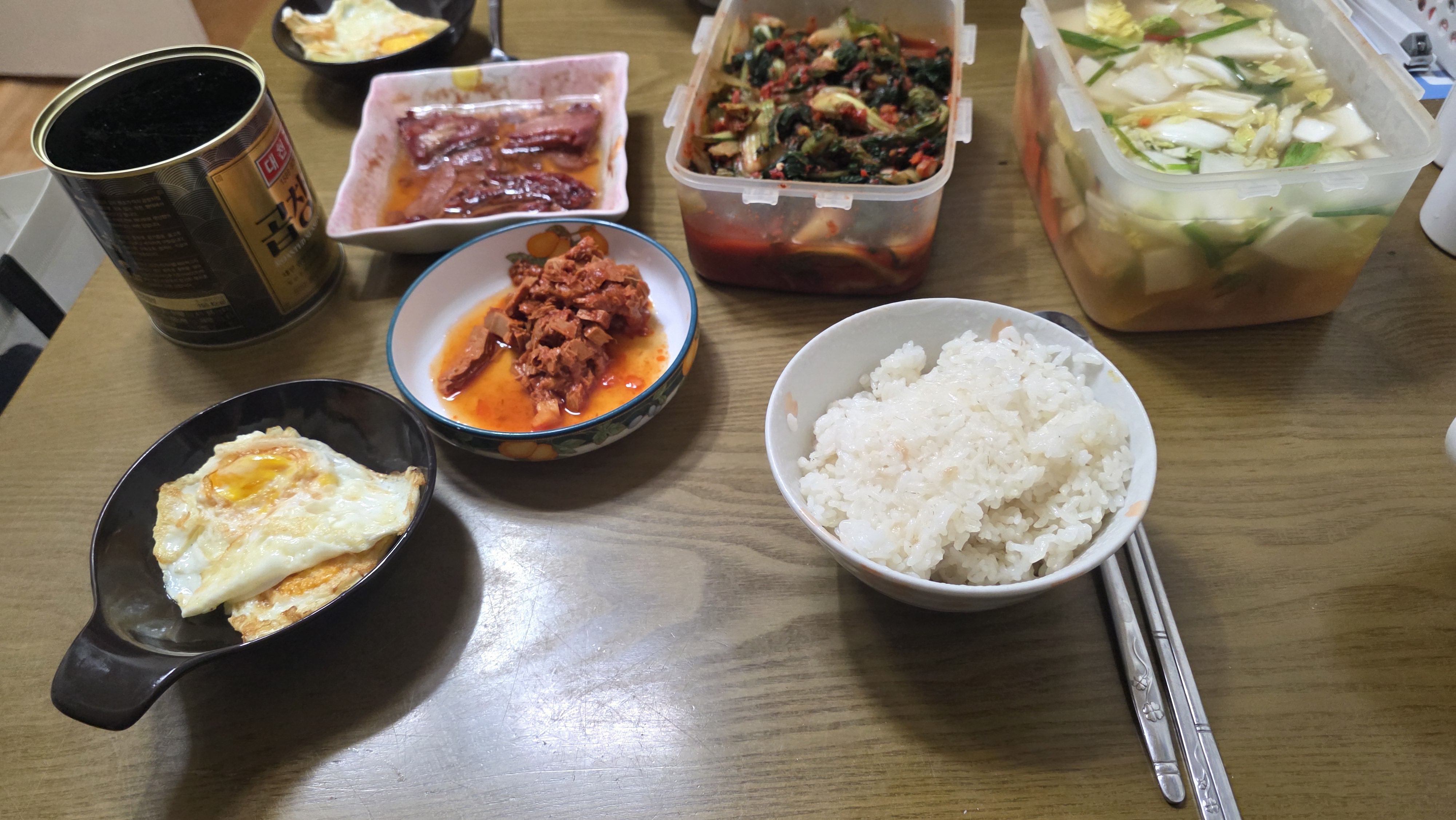 - 저녁: 밥 한공기, 계란후라이 2개, 오리훈제 약간, 참치, 김 (약 750kcal)