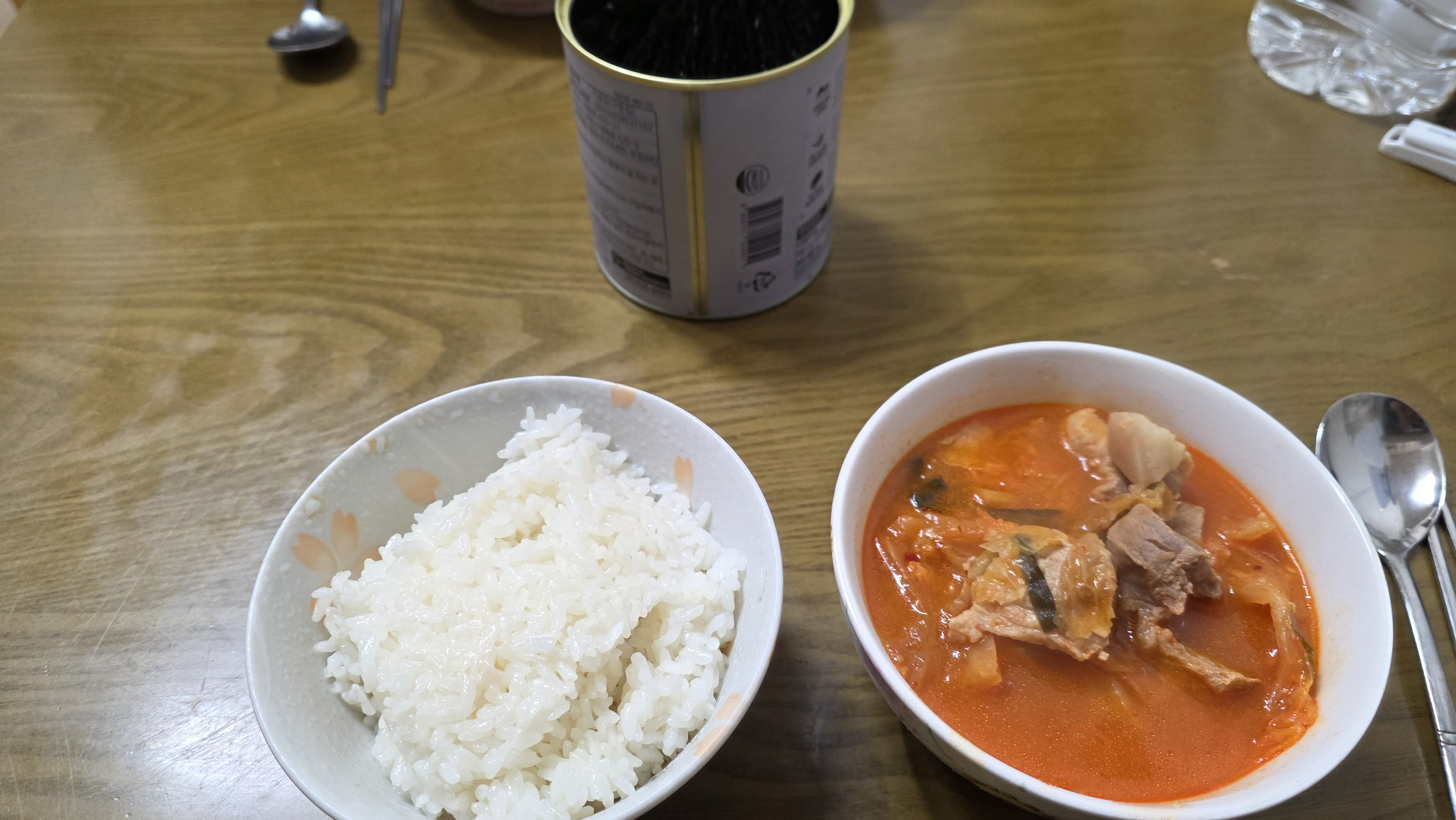 - 저녁: 밥, 김치찌개, 꽈배기 3개, 치즈스틱, 야쿠르트 3개 (약 1,350 kcal)