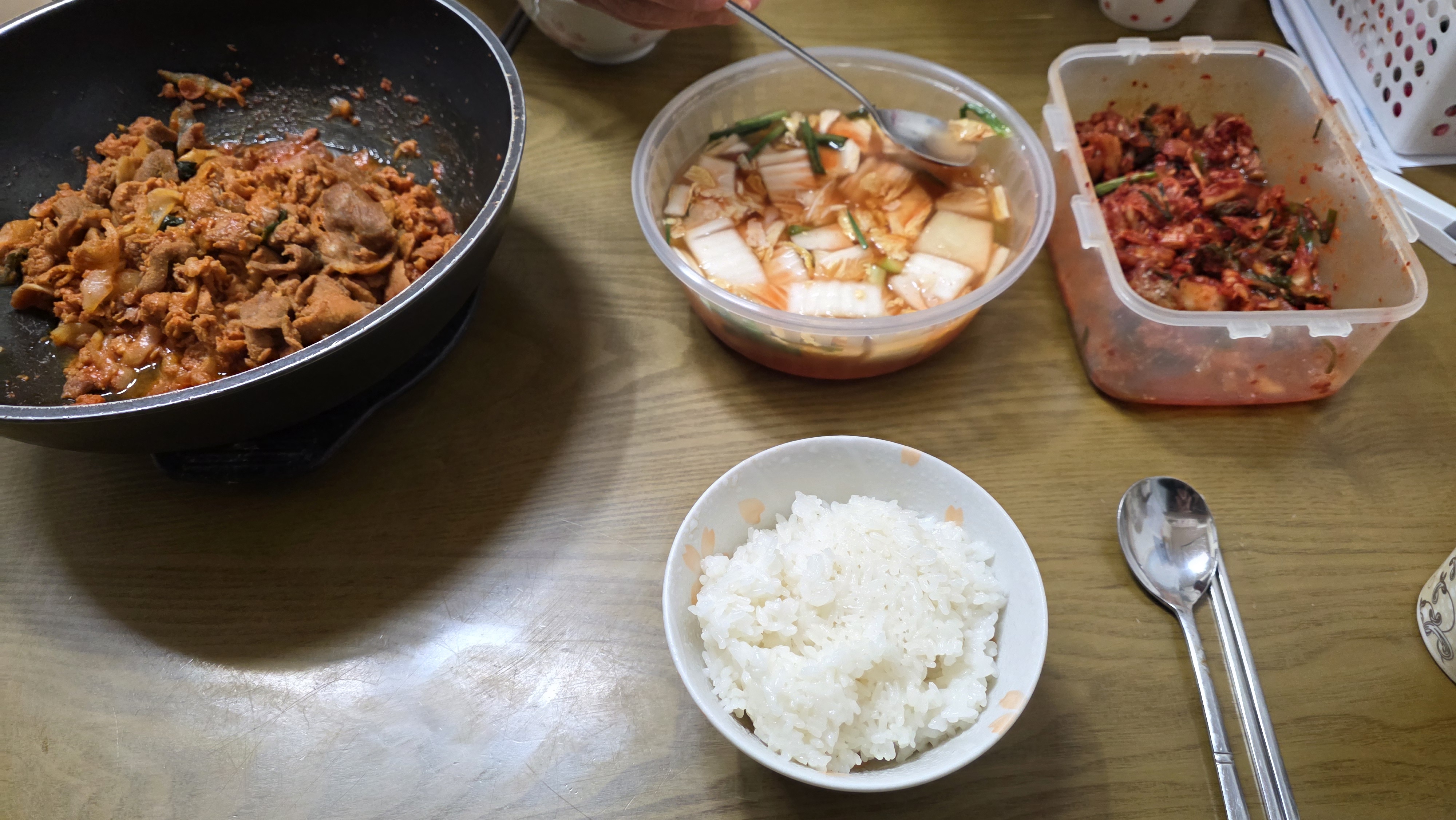 - 20:00 저녁 식사. 아버지와 제육볶음. 설거지 완료.