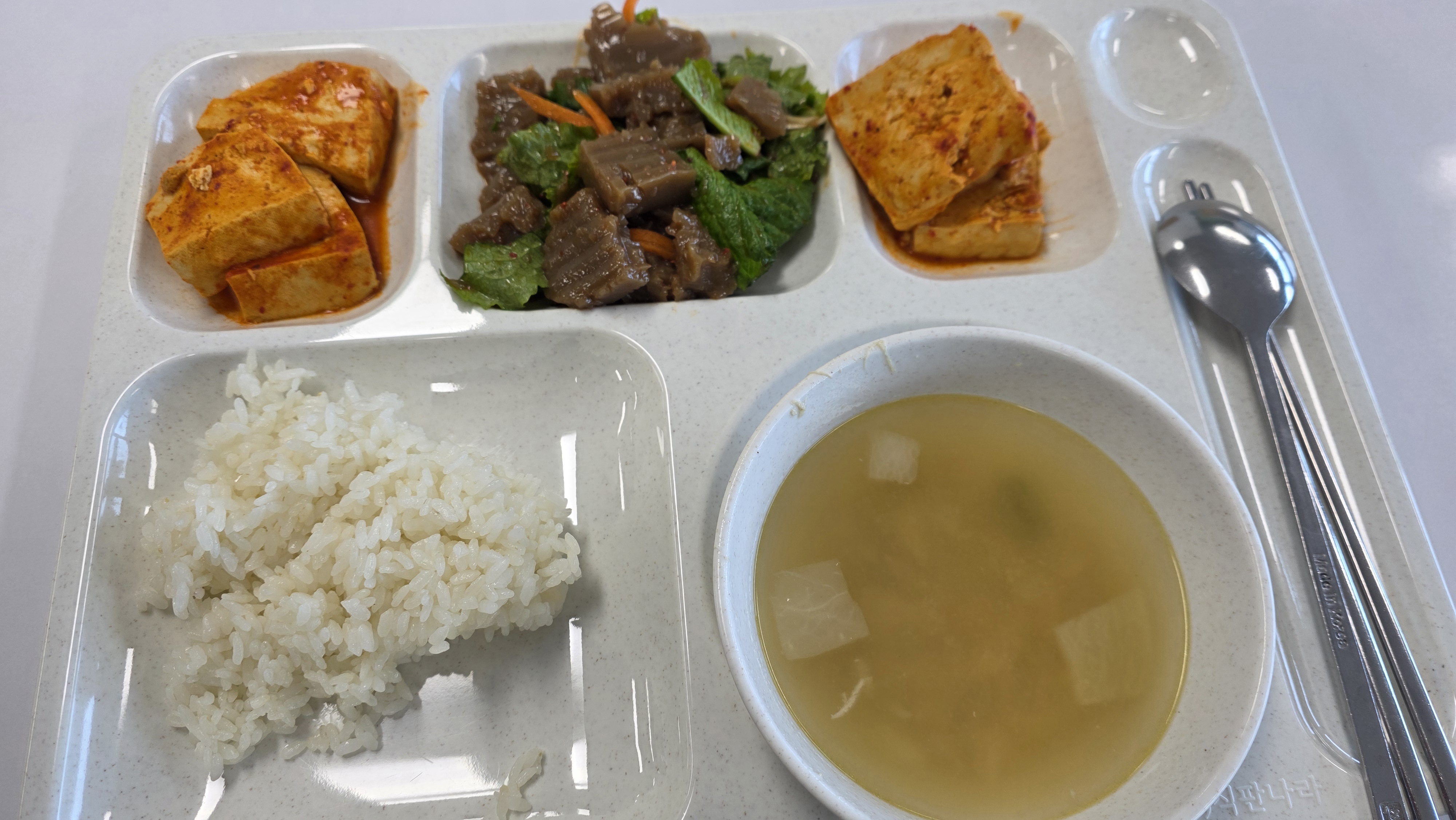 - 12:00 점심 식사 (쿠팡식). 밥, 무국, 두부조림, 도토리묵. 식후 쿠크다스 & 레쓰비. 양치/치실 완료.