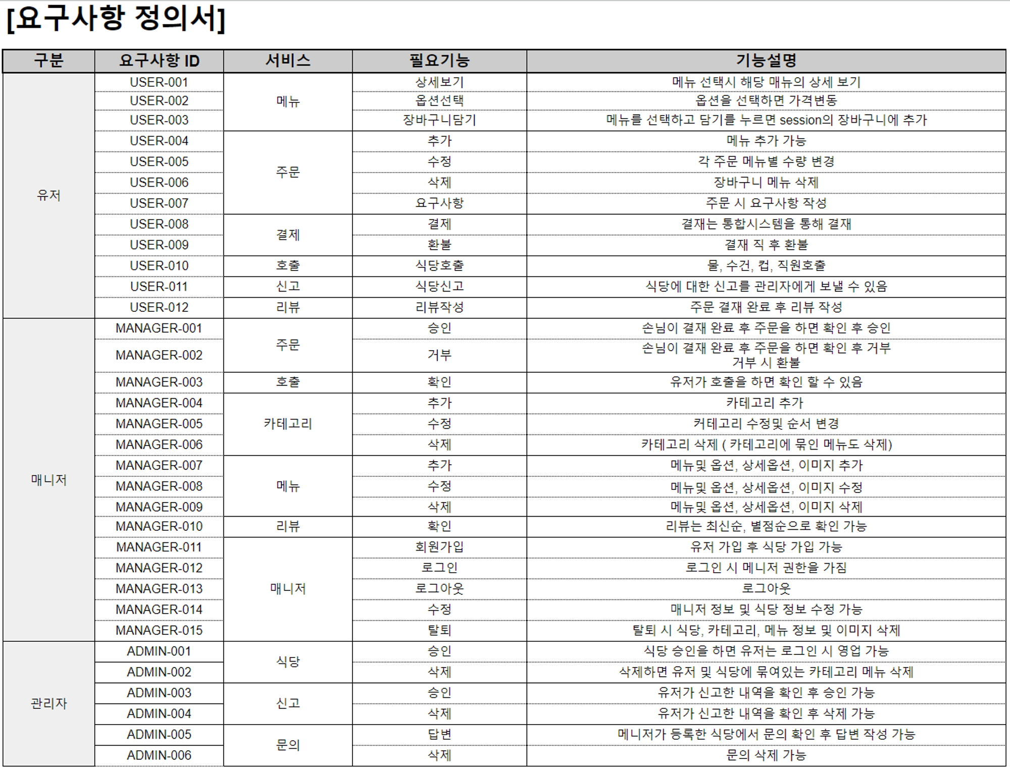 요구사항 정의서 [요구사항 정의서] 구분,요구사항 ID,서비스,필요기능,기능설명 유저,USER-001,메뉴,상세보기,메뉴 선택시 해당 매뉴의 상세 보기 USER-002,옵션선택,옵션을 선택하면 가격변동 USER-00