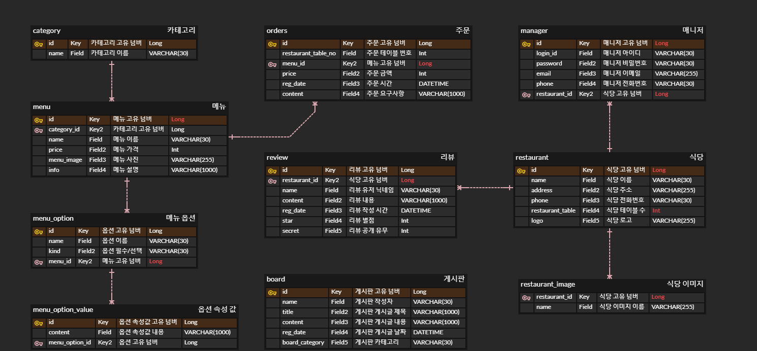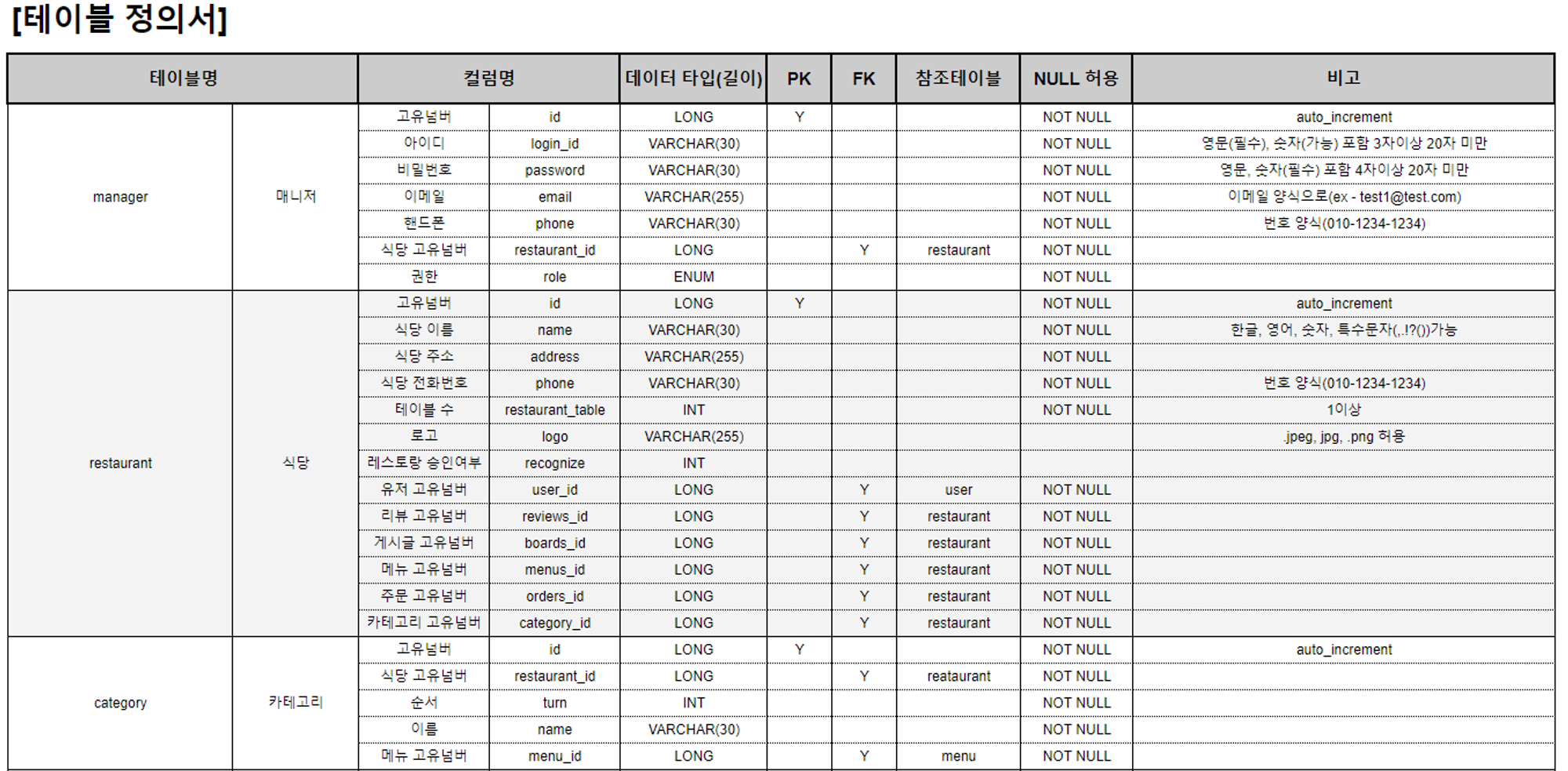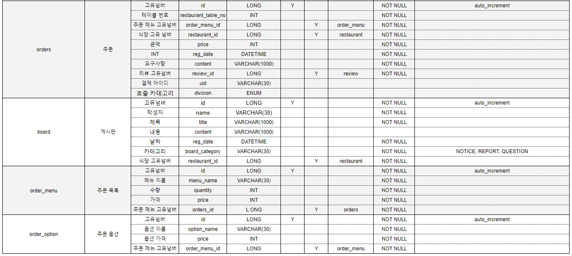 식당 고유넘버 restaurant_id LONG   Y restaurant NOT NULL